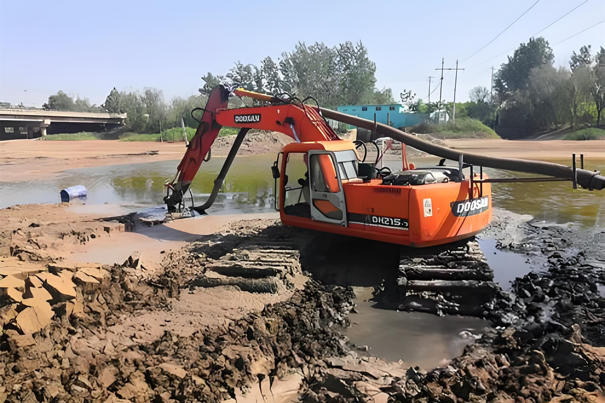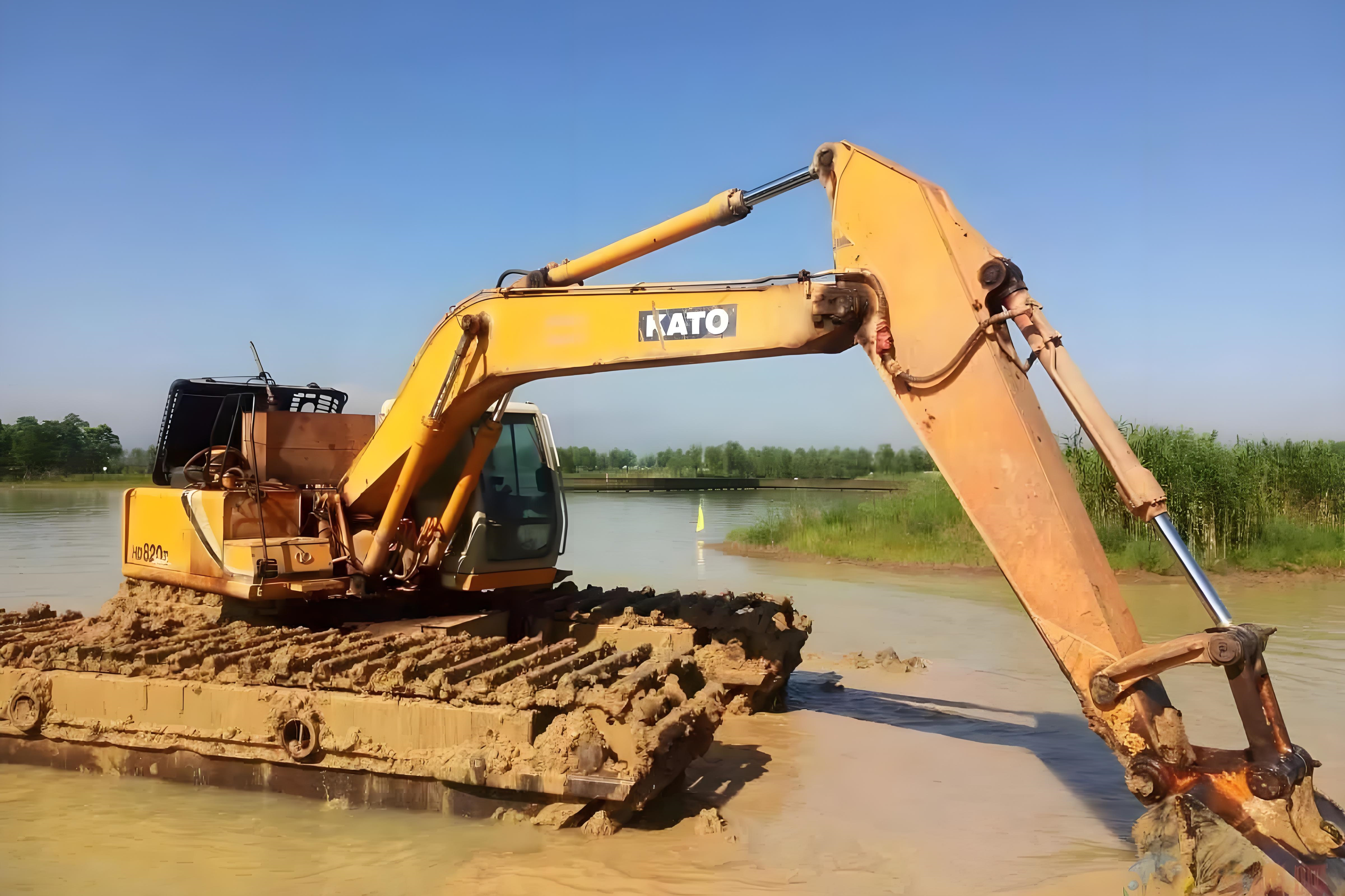 如果魚塘不想放水(比如里面還有魚苗,或者水源不好補充),就用 “水上挖機”。這種挖機底部有浮箱,能直接在水面上作業(yè)。
